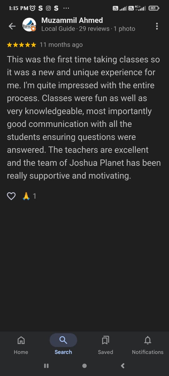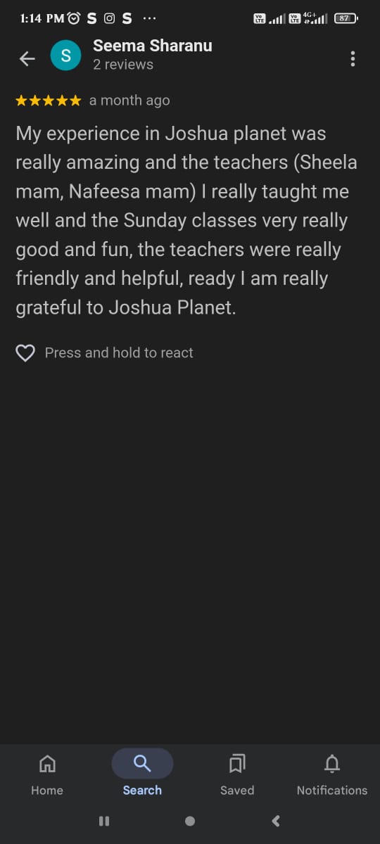 My experience in Joshua planet was really amazing and the teachers (Sheela mam, Nafeesa mam) I really taught me well and the Sunday classes very really good and fun, the teachers were really friendly and helpful, ready I am really grateful to Joshua Planet.
