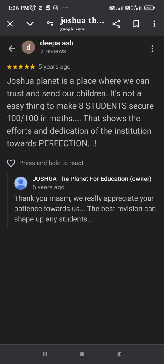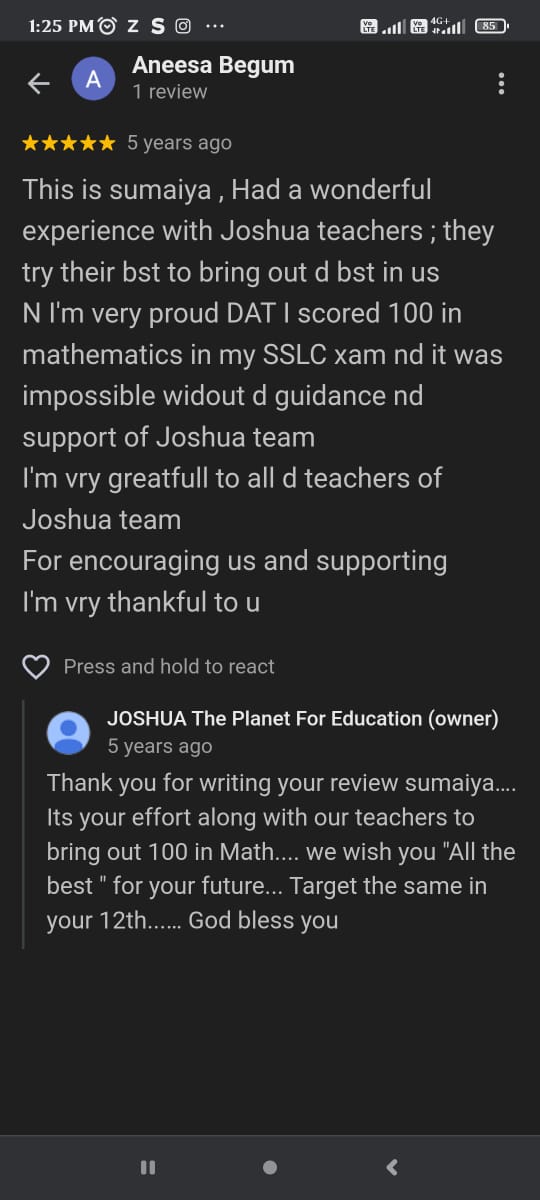 This is sumaiya , Had a wonderful experience with Joshua teachers ; they try their best to bring out d best in us N I'm very proud DAT I scored 100 in mathematics in my SSLC xam nd it was impossible widout d guidance and support of Joshua team I'm very great full to all d teachers of Joshua team For encouraging us and supporting I'm very thankful to u