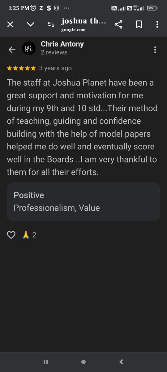 The staff at Joshua Planet have been a great support and motivation for me during my 9th and 10 std...Their method of teaching, guiding and confidence building with the help of model papers helped me do well and eventually score well in the Boards ..I am very thankful to them for all their efforts.